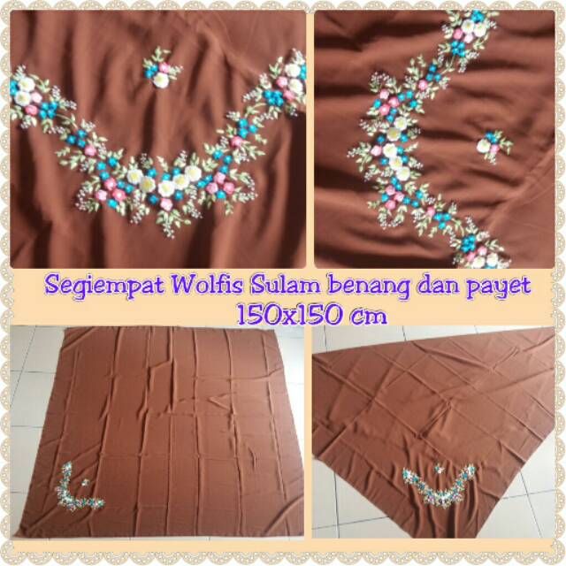 Jilbab Segiempat Jumbo Wolfis Coklat Sulam Benang Payet 150x150 Cm
