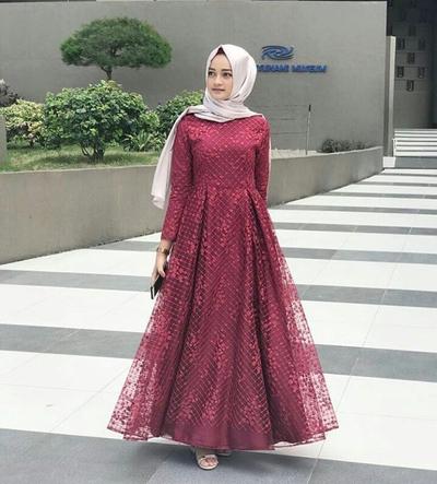 3 Model Dress Hijab Merah Aksen Brokat Buat Tampilan ...
